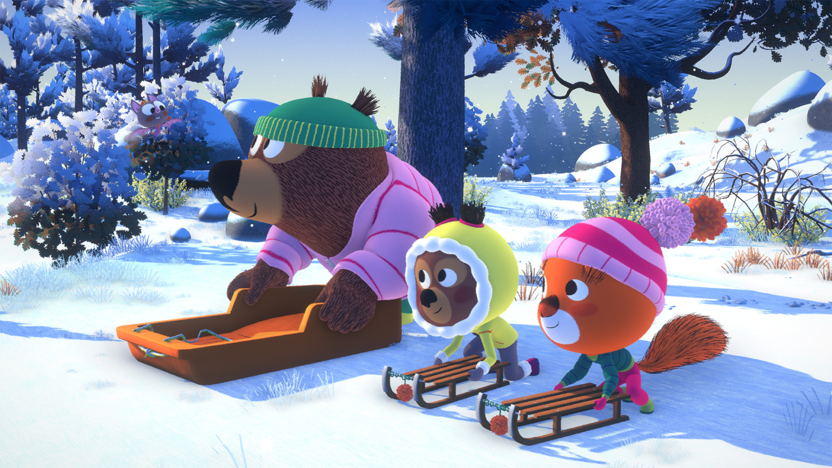 Edmond l'écureuil et son amie Lucy l'oursonne vivent dans un majestueux châtaignier, au coeur de la forêt. En famille et entre amis, ils jouent et grandissent dans une nature riche d'aventures. Même en hiver, quand tout est blanc et silencieux... Ils vont découvrir de belles surprises ! D’après l’oeuvre originale d’Astrid Desbordes et Marc Boutavant Edmond et ses amis, publiée aux Éditions Nathan © 2013 Programme : L’Hiver surprise : L’hiver arrive en avance cette année et Mima n’a pas encore fini sa liste «des choses à faire avant le froid et la neige». Edmond et Lucy font tout pour l’aider et découvrent par la même occasion comment la Nature s’adapte pour supporter cette longue période hivernale. Le Jour le plus court : En plein hiver, Edmond et Lucy pestent contre les journées qui sont si courtes. Si seulement ils pouvaient se débrouiller pour allonger le jour… Surtout qu’aujourd’hui c’est le plus court de l’année! La Chasse aux surprises :Edmond et Lucy trouvent qu’en hiver la forêt ne réserve aucune surprise. Il fait froid, il neige, tout est blanc… bref, c’est toujours pareil ! Pour leur prouver le contraire, Georges-Hibou leur concocte une chasse où chaque trésor découvert est une surprise de la forêt. Elle est vraiment trop forte cette forêt, au point de surprendre Georges-Hibou lui-même! L’Armée de l’hiver : Lucy jubile: elle a enfin terminé sa cabane… Mais au moment d’y accueillir ses amis pour y tenir une bataille de boules de neige, elle découvre qu’une tempête de neige l’a faite s’écrouler ! Grâce à Edouard, Georges-Hibou et aux incroyables propriétés de la neige, Lucy va finalement construire l’endroit idéal où tenir la plus grande et la plus palpitante des batailles.
